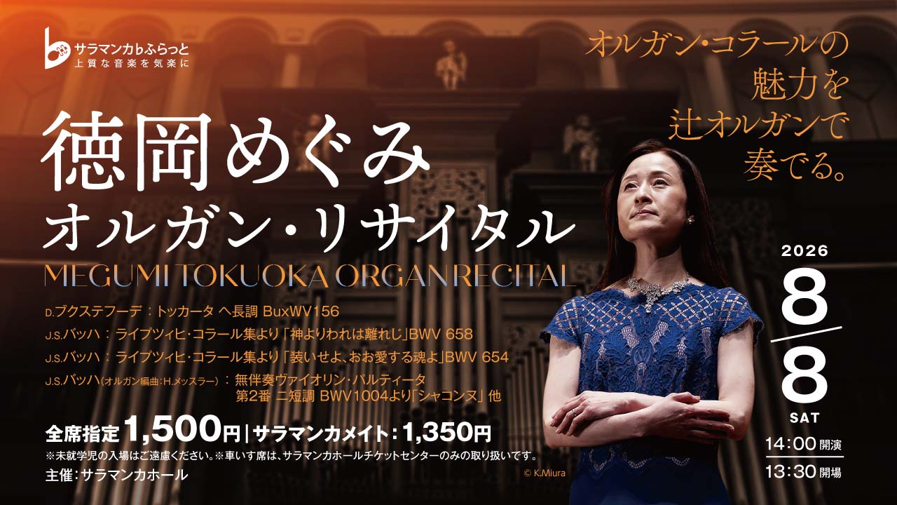 | プログラム | D.ブクステフーデ:トッカータ ヘ長調 BuxWV 156 A.ラインケン:フーガ ト短調 J.S.バッハ:ライプツィヒ・コラール集より「神よりわれは離れじ」BWV 658 B.マター:「若き乙女」によるファンタジー J.S.バッハ:ライプツィヒ・コラール集より「装いせよ、おお愛する魂よ」BWV 654 J.S.バッハ(オルガン編曲:アンリ・メッスラー):無伴奏ヴァイオリン・パルティータ 第2番 ニ短調 BWV1004より「シャコンヌ」 |